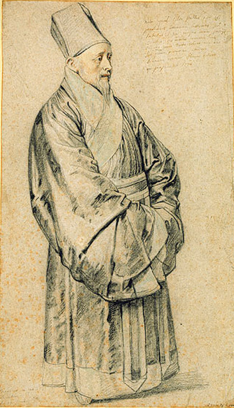This sketch by Peter Paul Ruebens of the French Jesuit Nicolas Trigault makes for an interesting visual contrast. The note on the drawing states that he is adorned in Chinese dress.